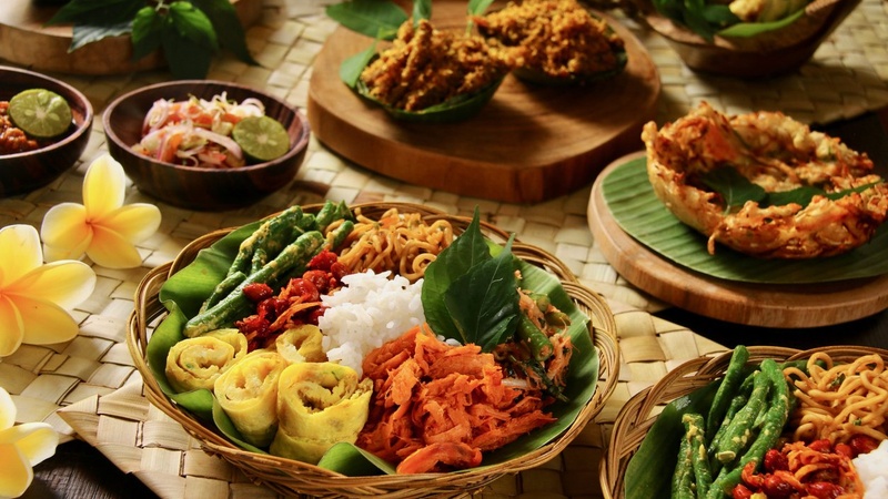 Традиционная индонезийская кухня основана на использовании свежих овощей, морепродуктов, риса и большого количества специй. Основу большинства блюд составляет рис — он подаётся практически к каждому приёму пищи. Среди самых известных компонентов — кокосовое молоко, листья лайма, чеснок-шалот, пальмовый сахар и сарси (рыбный соус). Местные блюда часто готовятся с добавлением острого соуса самбал, который придаёт им характерную жгучесть. При этом даже в рамках одного региона рецепты могут сильно различаться: например, балийская кухня отличается обилием свинины, тогда как на Яве и Суматре чаще используют курицу, говядину и тофу.